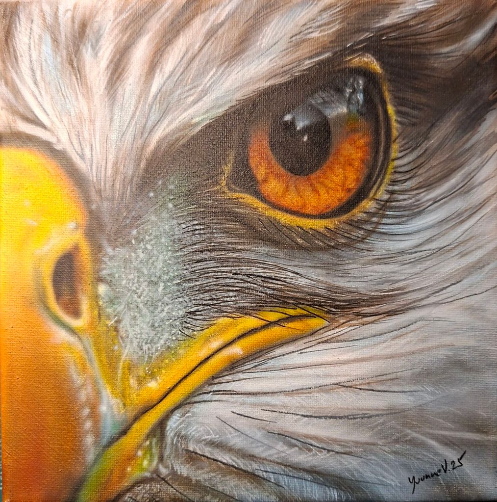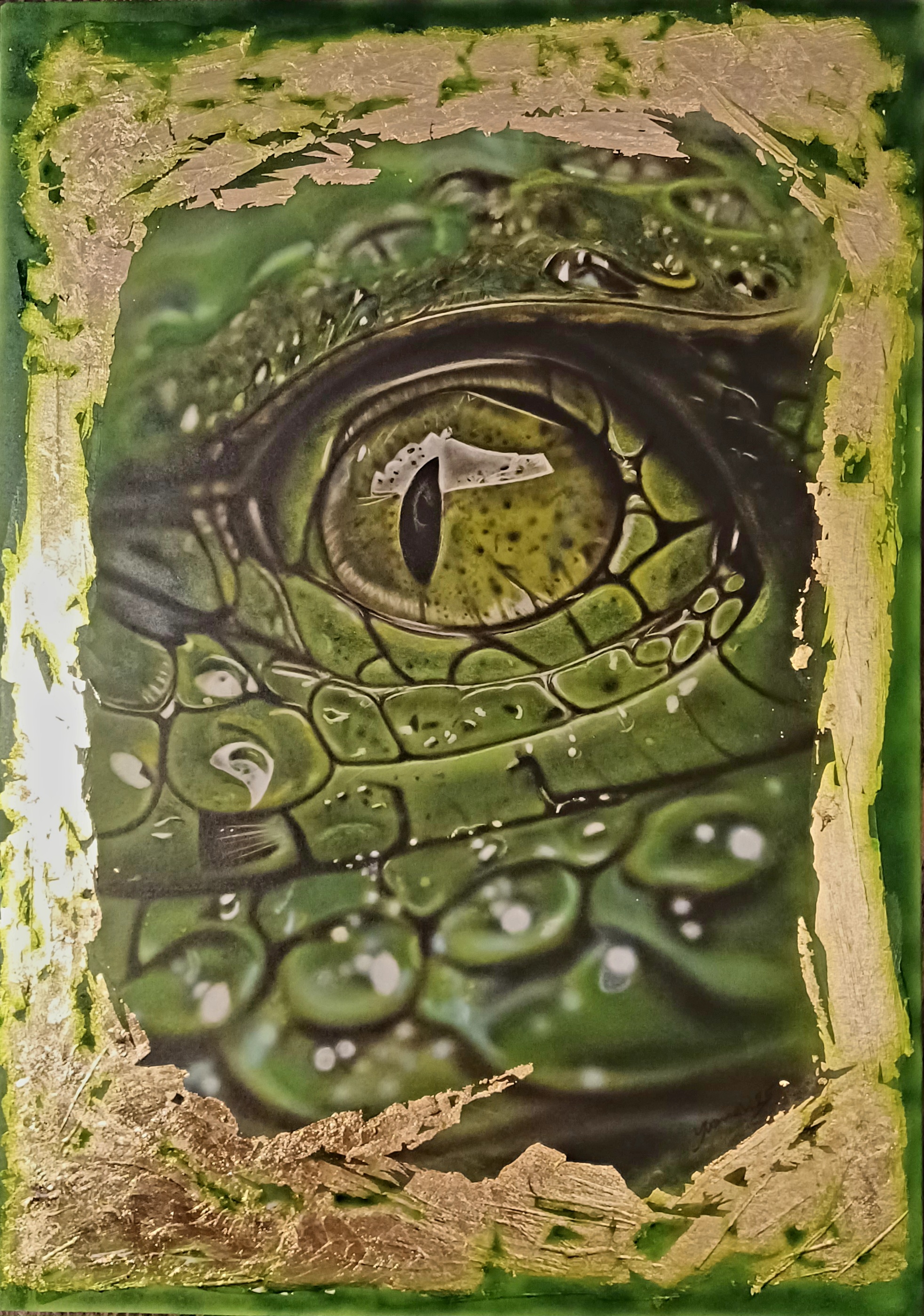 „WHISPERS OF THE WIND “ Airbrush auf ArtReflex Board 35X25.„Adlerauge“ Airbrush auf Leinwand 20X20.„PORK EYE“ Airbrush auf Leinwand 20X20.„Krokodil“ Airbrush/Mischtechnik auf Syntetikpapier A4.„Echsenauge“ Airbrush/Blattgold auf ArtReflex Board, 25X35