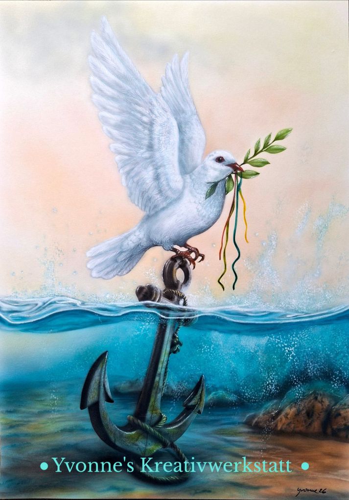 Das Thema Hoffnung war für mich ein inspirierendes Thema dieses Auftragsbild zu malen, angefangen mit der Taube. Diese erinnerte mich sofort an die Geschichte von Noah als wieder Land in Sicht war und die Taube einen Ölzweig auf die Arche mitbrachte. So hatte ich auch ziemlich schnell vor Augen wie das Bild aussehen soll. Der Anker steht ja symbolisch für Hoffnung. Auf dem Bild ist der Anker im Wasser dargestellt; d.h. an diesem Ort ist er jetzt verankert und hat vielleicht noch eine Aufgabe.