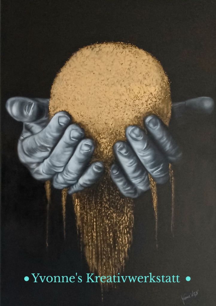Diese Darstellung mit den Händen war eine Idee meines Partners um dem Bibelvers aus dem Psalm 31,16 Ausdruck zu verleihen. Der Sand (die Zeit) rieselt durch die Hände und man sollte sie bewusst leben.