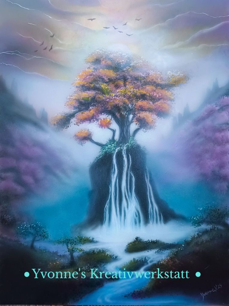 Das Bild zeigt eine faszinierende Traumlandschaft, in deren Zentrum ein großer, majestätischer Baum steht. Seine Äste breiten sich weit aus und sind mit üppigem, farbigem Laub bedeckt, das sanft im Wind zu wiegen scheint. Unter dem Baum fällt ein klarer Wasserfall in die Tiefe, dessen Wasser in kleinen Kaskaden über glatte Felsen strömt. Das Licht der Szene ist weich und diffundiert, fast wie in einem sanften Morgennebel, was der Landschaft eine geheimnisvolle und friedvolle Atmosphäre verleiht. Umgeben ist alles von sanften Hügeln und leuchtenden Blumen, die Farben und Lebendigkeit hinzufügen. Dieses Bild verbindet Ruhe und Kraft und lädt den Betrachter dazu ein, in eine Welt voller Naturwunder und stiller Schönheit einzutauchen – eine perfekte Mischung aus magischem Realismus und träumerischer Idylle