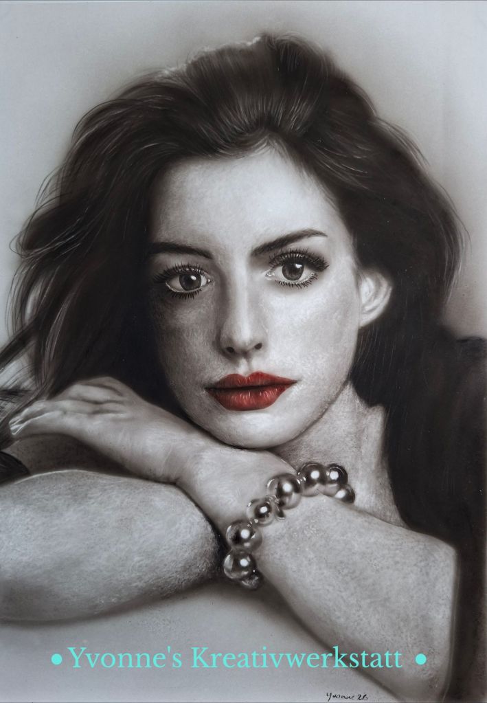 Anne Jacqueline Hathaway ist eine US-amerikanische Filmschauspielerin und Oscar-Preisträgerin. Referenzfoto: Pinterest. Ein besonderes Highlight sind die roten Lippen.